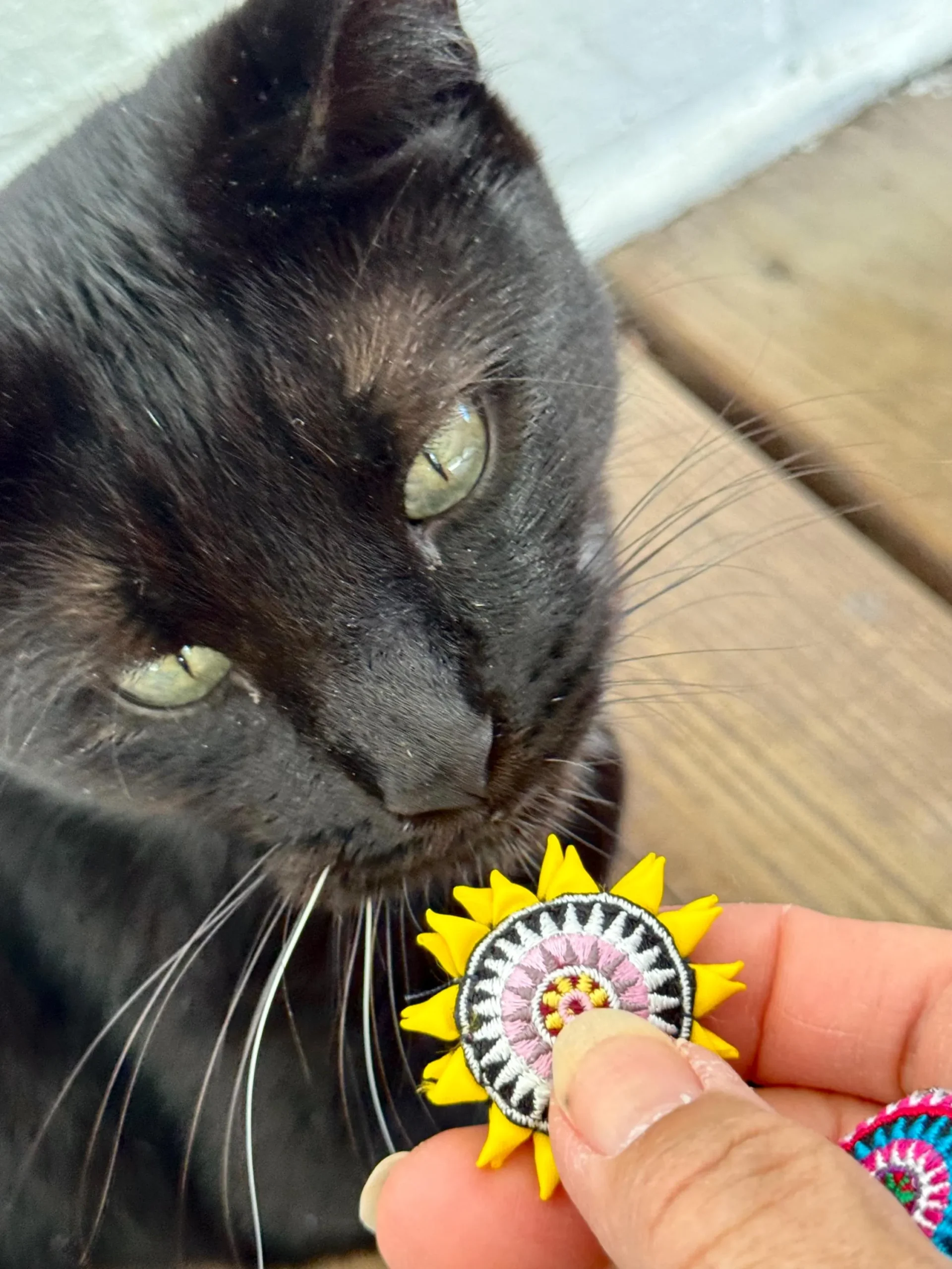 Scatterballs: These handmade embroidery circles are traditional patterns by Hmong tribes in Thailand. I sell modern Scatterballs as cat toys: they bounce, wobble and move like little prey.