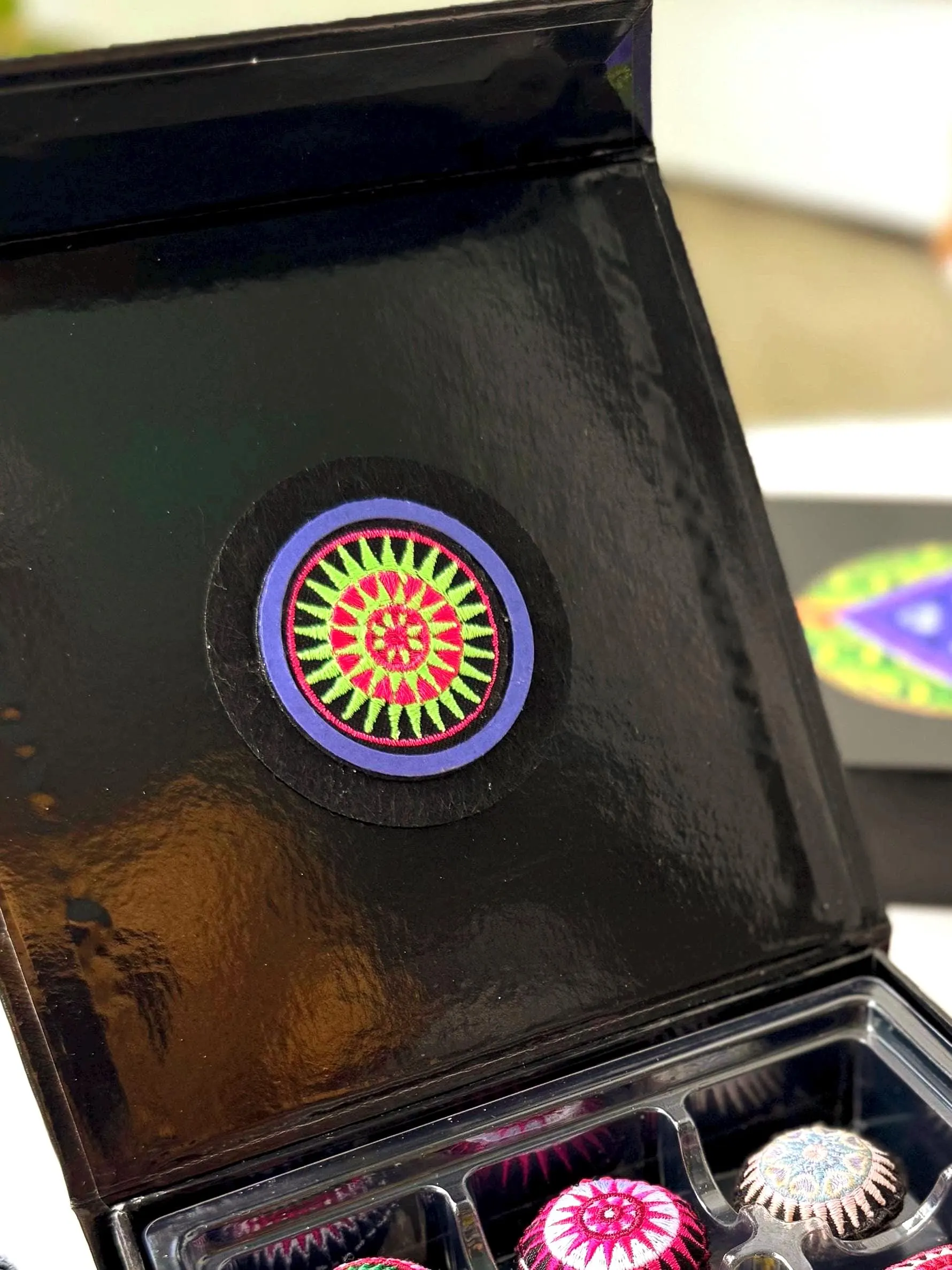 The box itself is a work of art, worthy of display or for holding mementos. It’s a shiny black box, with magnetic closure. Each Scatterball nests in its own compartment with paper candy cup, like a fancy bonbon. I embellish the top and inside of the box with handmade designs that reflect the Hmong culture, including an embroidered circle and an “elephant’s foot” pattern. Remove the liner compartment, and the box itself can be used as an attractive trinket box, jewelry box, and container for keys, cuff links, game pieces, cards, photos, smart phones, air pods, and other small objects. It’s like getting two gifts in one.