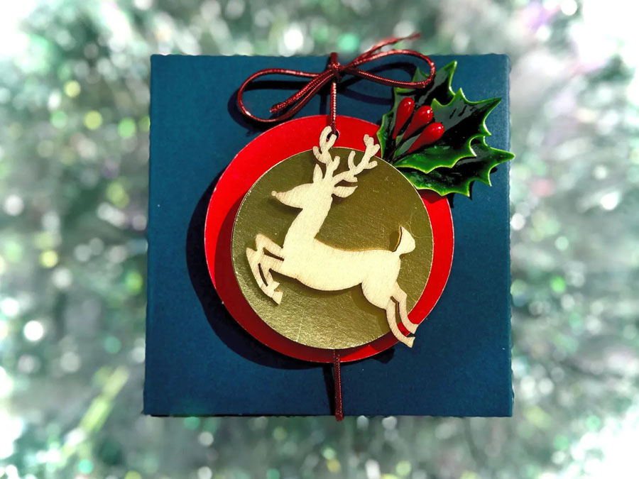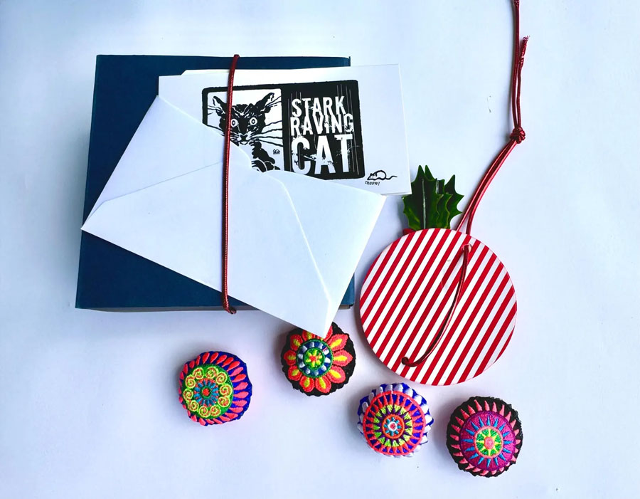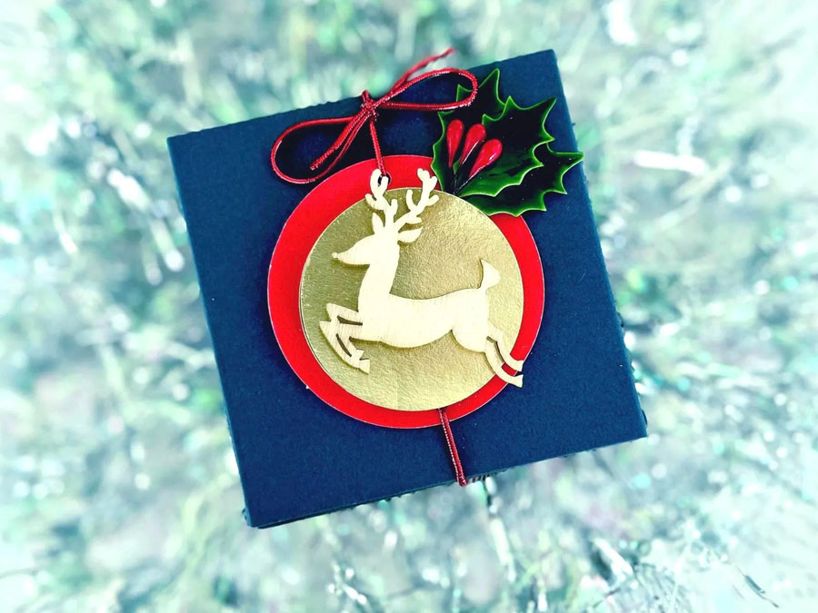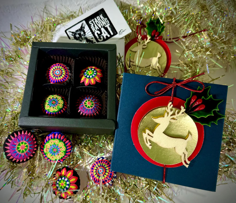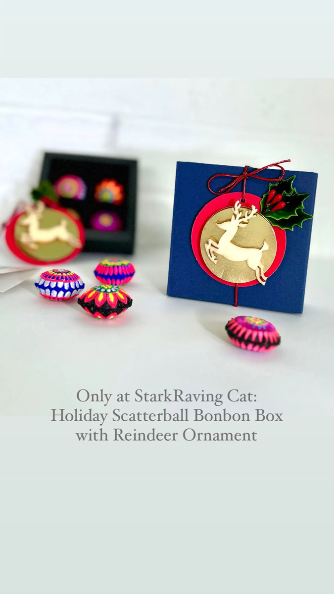 Ready to ship! Four festive Scatterballs, with reindeer and holly ornament, in a deep blue bonbon gift box. Display them as home accents or gift them to a cat lover. This ready-to-ship Christmas present includes a gift tag: we’ll even print your message on the tag!