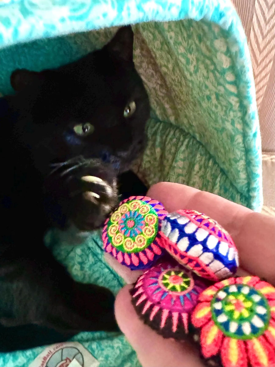 Check out all our bestselling Scatterballs: They are handmade from embroidered fabric, made by Hmong tribes in Thailand. Scatterballs move like prey: they bounce, wobble, and scoot across a floor. Cats love to chase them as cat toys (though this collection may be too beautiful to lose under the couch). They’re about 1 to 1-1/4 inch in diameter, and sizes may vary. See the image of them in my hand for reference.