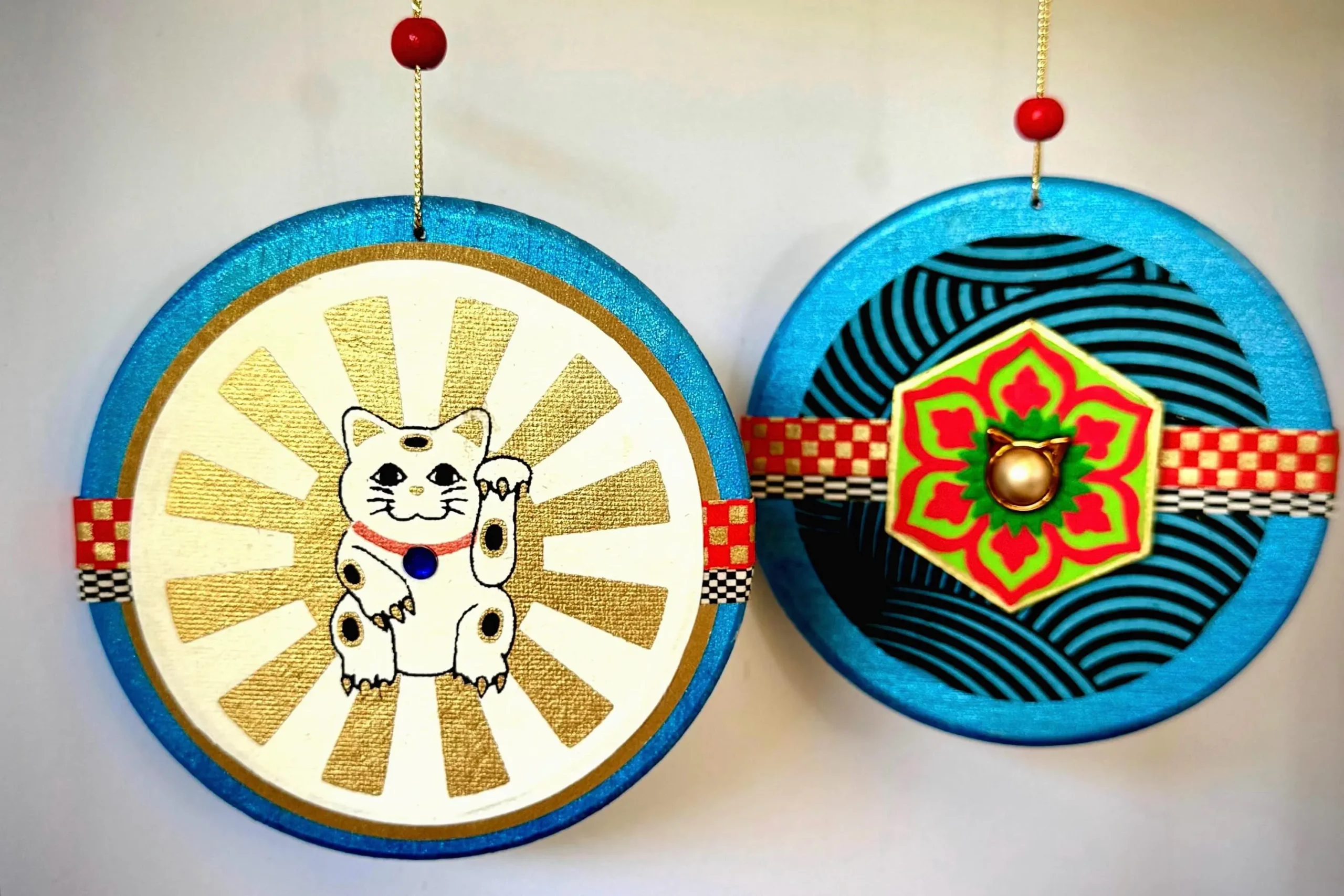 This two-sided Christmas ornament features a Japanese “beckoning” cat surrounded by shiny gold rays; on back, a pearlized cat head pops up from a layered poinsettia flower. The metallic blue wood base is big: about 4-inches in diameter, 3/8 inch thick, and twirls easily to show both sides. It comes with a black gift box and tie, ready to give to pet lovers and collectors of animal-themed ornaments. Hang it from a Christmas tree, mantle, or as a year-round symbol of good fortune.