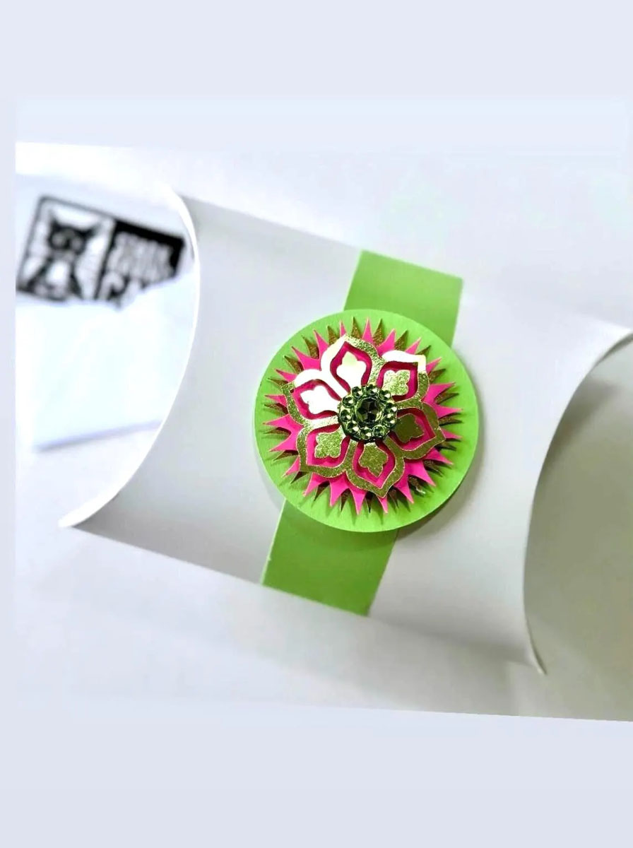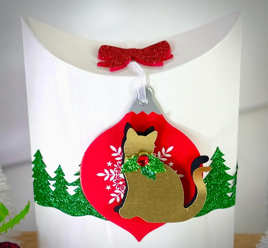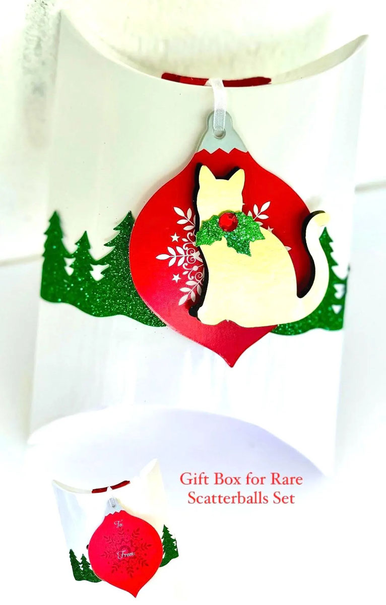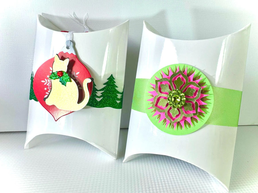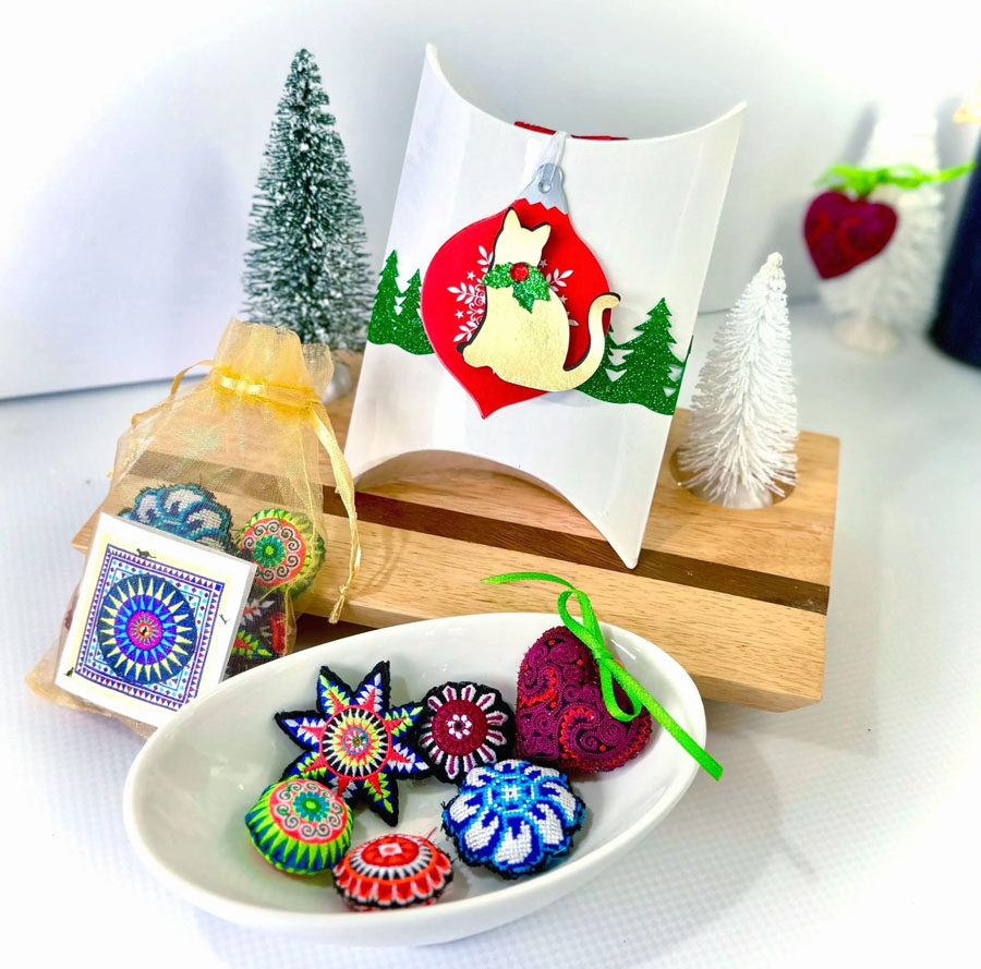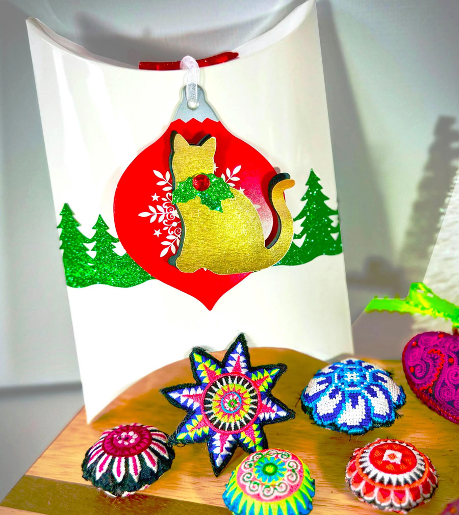 Gift wrapped, ready to ship! Choose from a Christmas Cat ornament or Chartreuse Jeweled Starburst — I handmake these layered pieces to decorate the white pillow box. A gift card in envelope, with your personalized message, slips under the ribbon on the back of the box. I tuck the 6 shapes into a pretty organza bag before slipping into the pillow box. It’s a festive gift that announces: “You are special” and especially great for hard-to-shop-for friends.