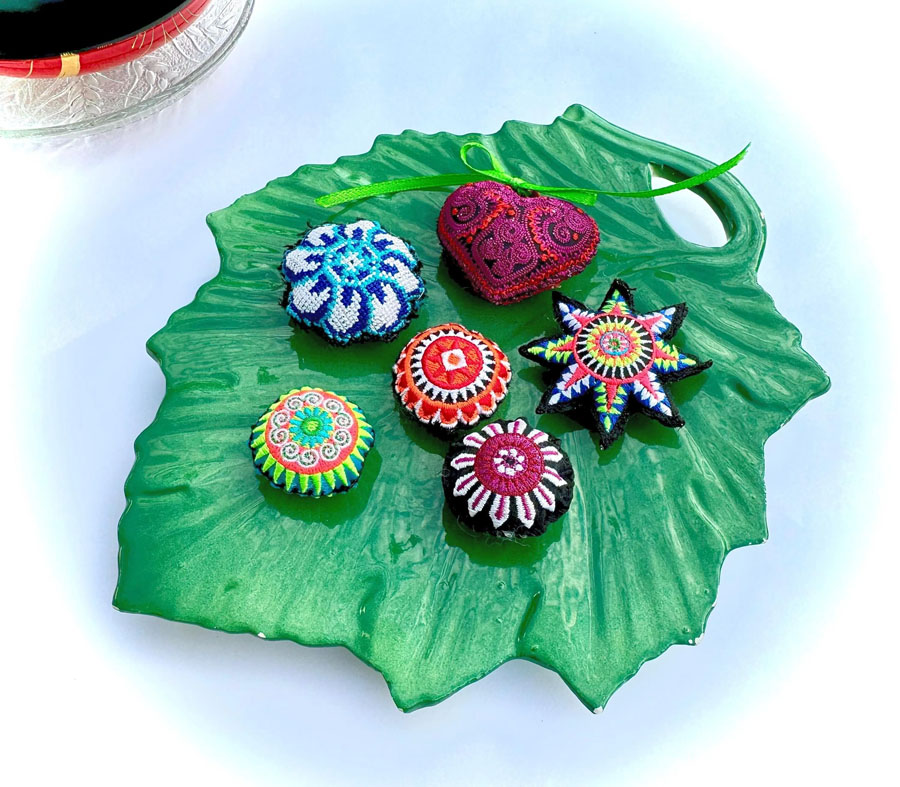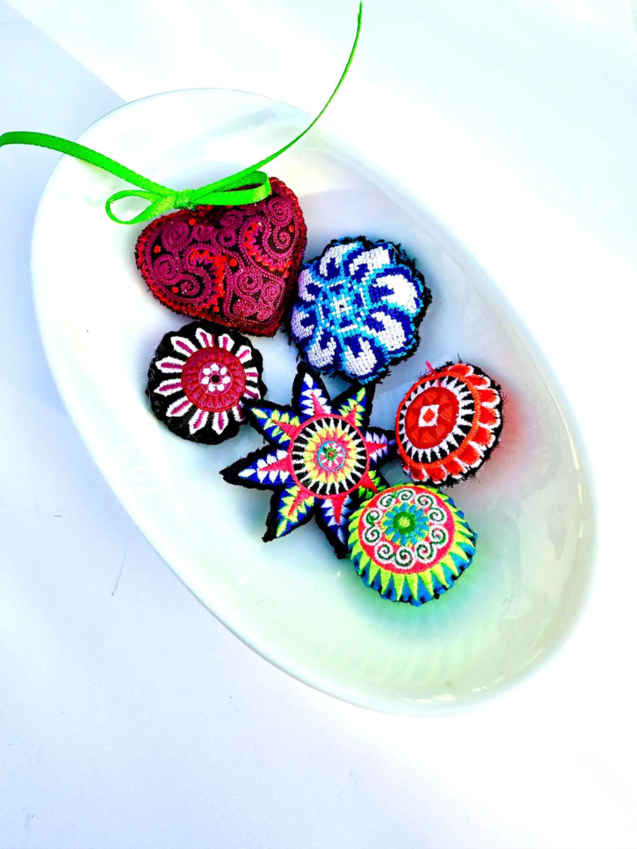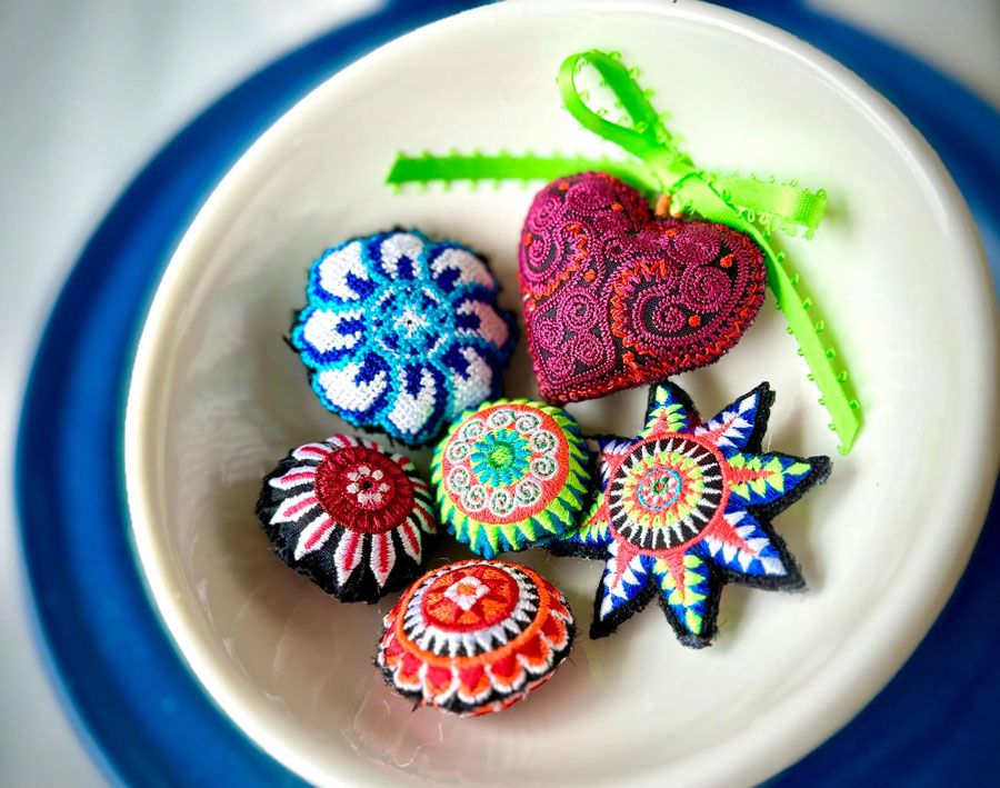 Only 20 people will get this handmade boho gift set: it’s that rare! A heart; a star; swirly blue flower; and three special patterns – six embroidered designs that are simply no longer available. It’s an artistic mix from my personal stash, worthy of display in a small bowl or basket — if your cats allow. (Our standard Scatterballs are both bestselling cat toys *and* home decor accents.) Sizes of these colorful pieces range from 3 inches in diameter to 1-1/4 inches.